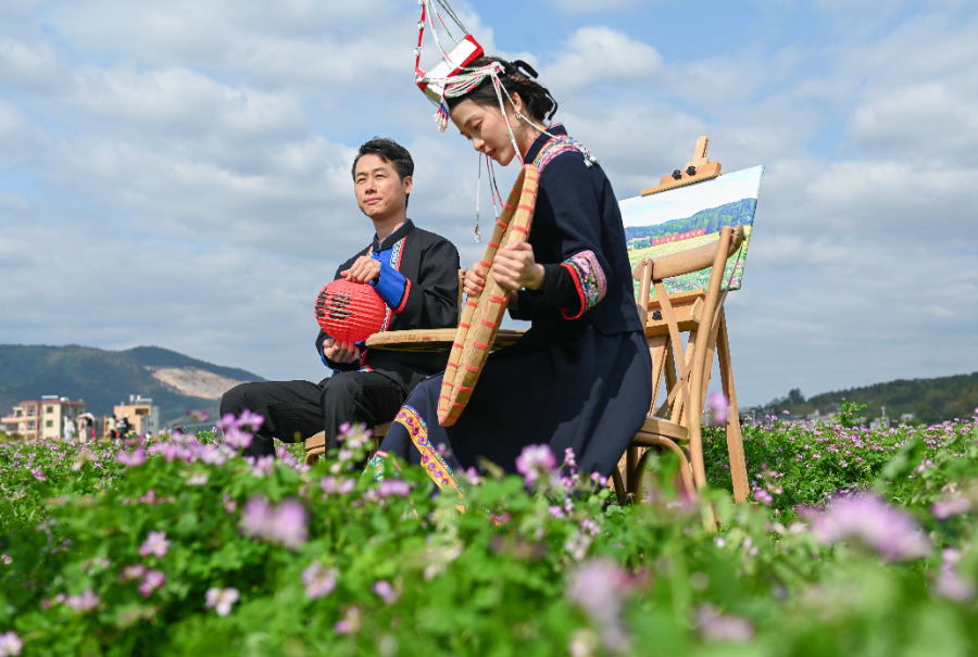 2025年3月16日,新人在广东河源市东源县柳城镇的紫云英花海中婚拍留念。新华社记者 肖恩楠 摄