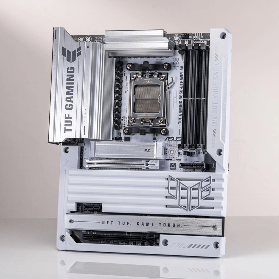 展区同步带来TUF GAMING B850-BTF WIFI W背置主板。作为华硕首款AMD BTF主板,以银白配色演绎利落机甲风格,搭配背置接口设计,带来更干净的整机视觉与更便捷的安装体验。高效稳定的供电设计与扩充能力,满足玩家打造白色无线主机的需求。