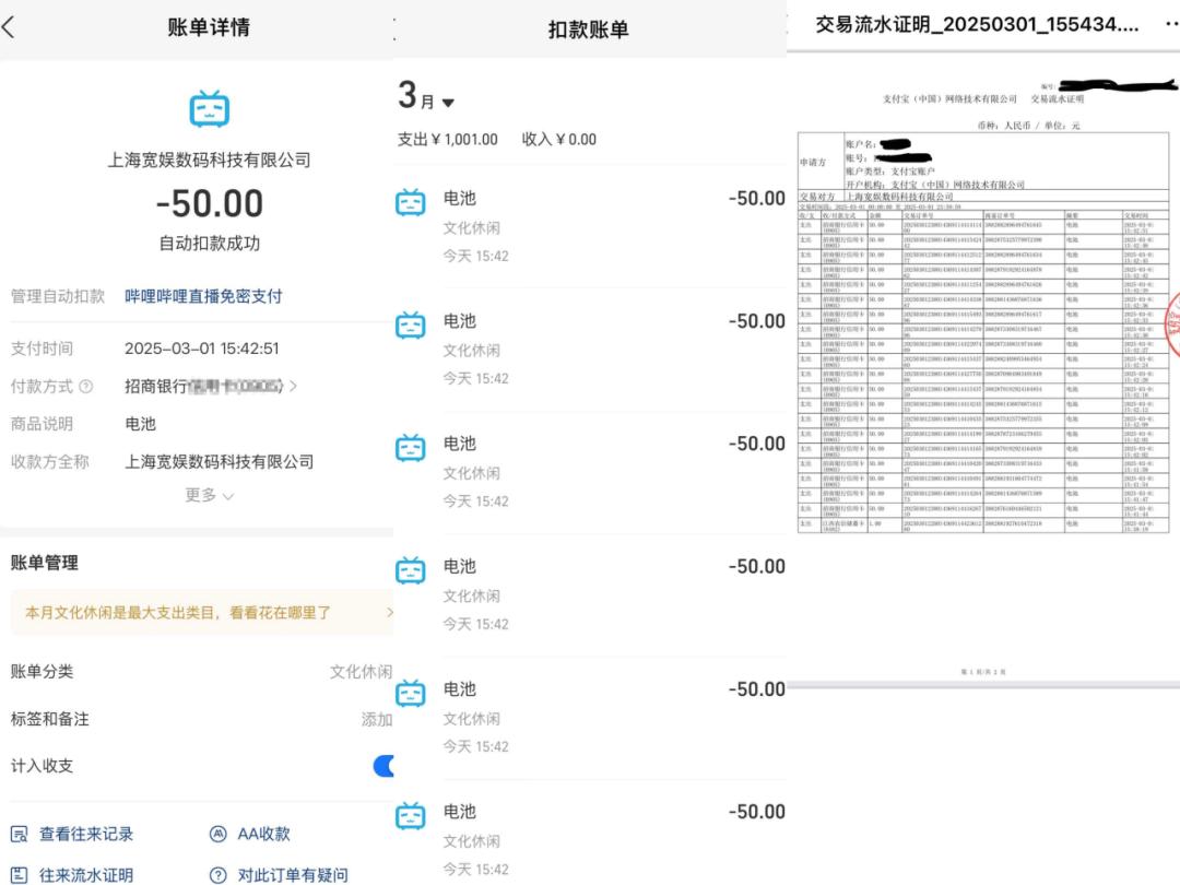 该网友提供的多张截图显示,3月1日15时41分44秒至15时42分51秒,账户被连续刷走20笔50元,几乎每3秒一笔,这些钱以打赏礼物的形式进入收款方上海某数码科技有限公司。