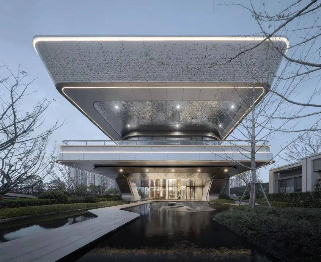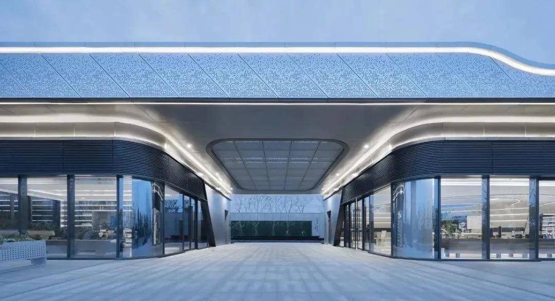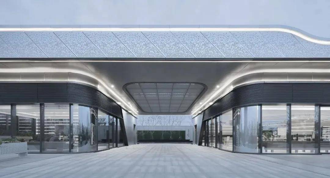 建筑的整体材质以银白色为主,摒弃眼花缭乱的材质,将建筑柔和地置入在场地中,与景观相互交融,既简约又不失精致。通过对材料和细节的精工把控,营造出现代未来感的立面造型,将价值融入调性打造新城地标。