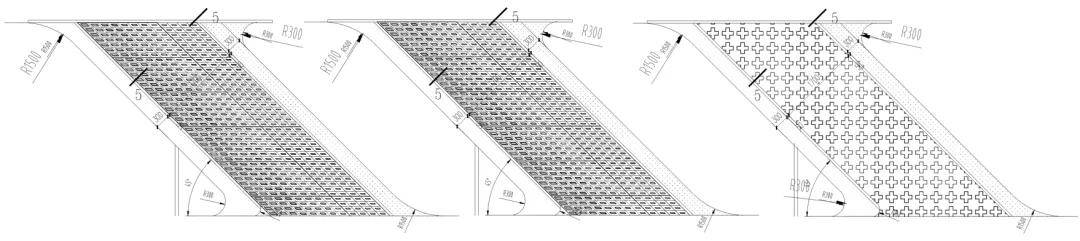 示范区实景针对穿孔板的穿孔率和穿孔样式的选择上,通过模型模拟、1:1实体打印、工厂预制进行效果对比,结合室外立面效果以及透光情况决定。