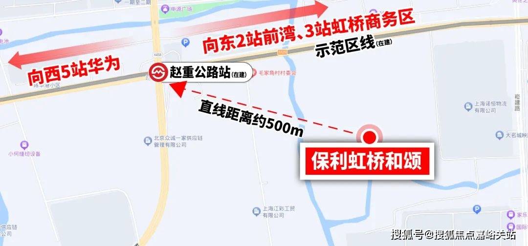 保利虹桥和颂就是当下该级别少有的真轨交房,直线距离示范区线(在建)赵重公路站仅约500米。示意图,图中距离来源百度地图测量