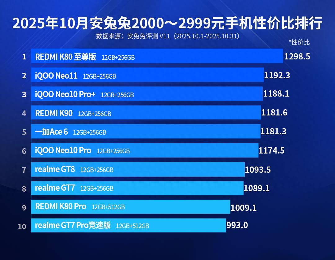 对于2025年10月安兔兔中端手机性价比榜单,亓纪的想法是这样的:预算在1800元左右的线+机型,典型代表是红米K80至尊版和iQOO Z10 Turbo+。预算在2500元左右的话,最新发布的几款性能此次旗舰都各有特色,喜欢中屏全能旗舰就选红米K90,喜欢潜望式长焦就选线,喜欢游戏和大电池就选一加Ace6和iQOO Neo11。