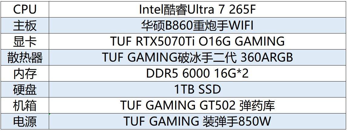 接下来给大家推荐一套冷酷军工风电竞小钢炮。以华硕B860重炮手WIFI主板为核心,搭配Intel酷睿Ultra 7 265F处理器、华硕TUF RTX5070Ti O16G GAMING显卡等高性能硬件,高帧畅玩无压力!