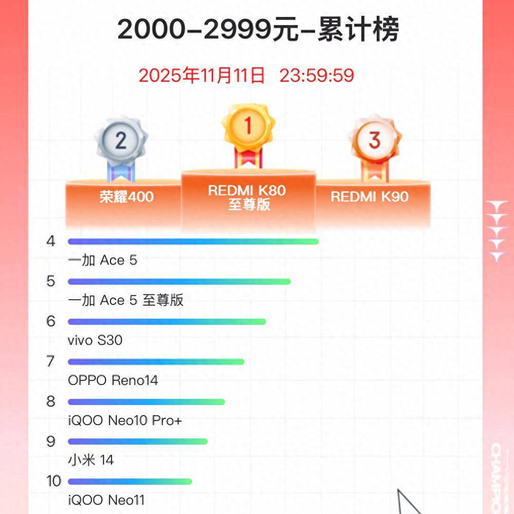 今天分享京东双11中端手机畅销榜,价格区间是2000-2999元,红米K90仅排名第三,排名第一的是红米K80至尊版。最新发布的iQOO Neo11排名第十,剩下的8款均为旧款机型,包括曾经的小屏旗舰,轻旗舰和性能中端手机等等,以下是榜单的详细内容。