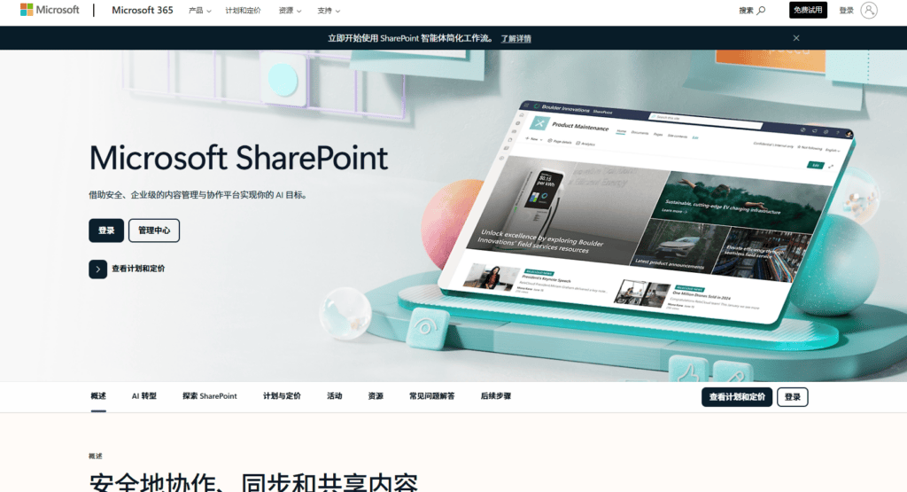 产品简介:SharePoint 是 Microsoft 365 生态中的核心组件,主要用于构建企业内网、文档管理系统和团队协作空间。