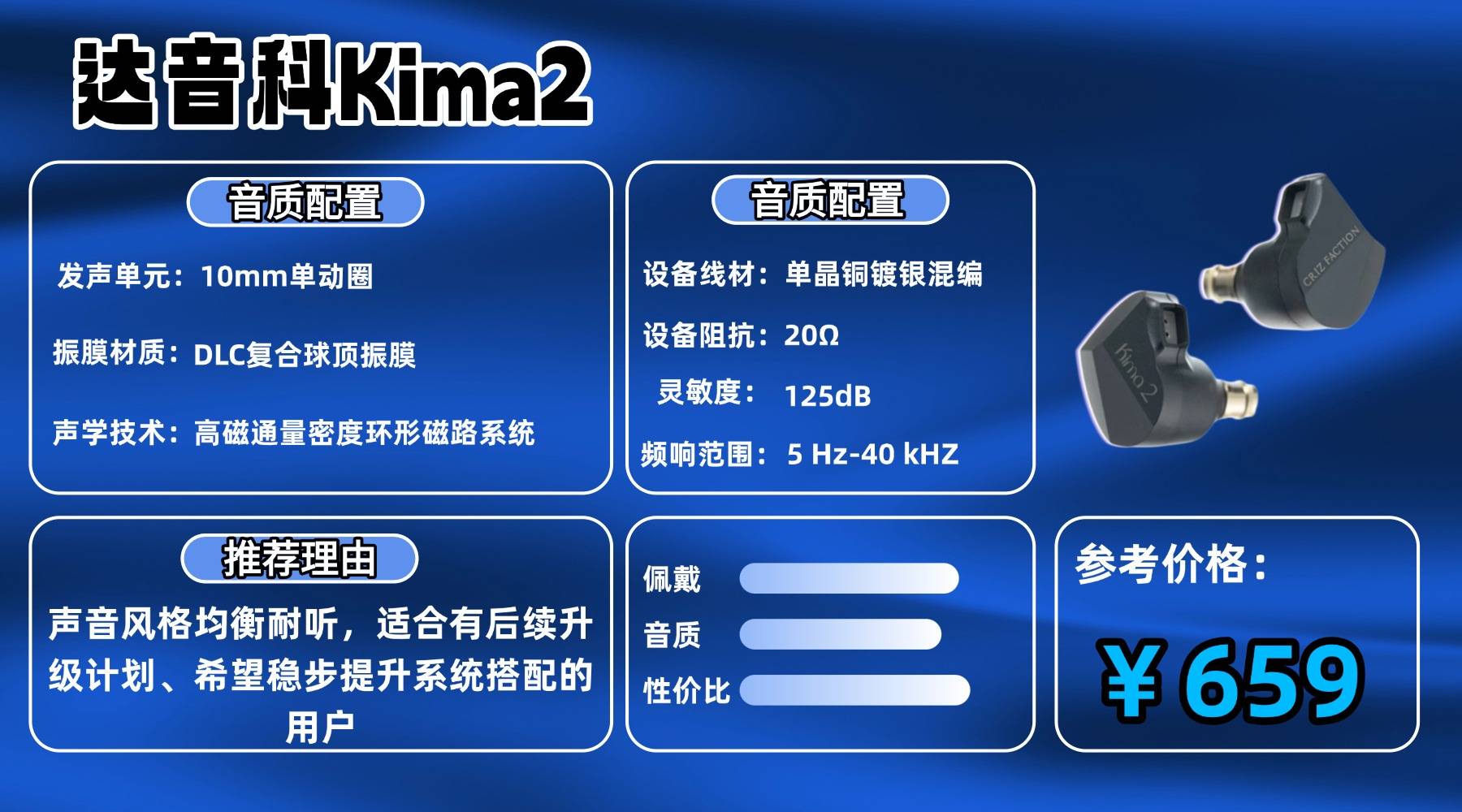 达 音 科 Ki ma 2 搭载 10mm 外磁式 DLC 复合振膜动圈,整体声音走的是偏稳重、偏理性的路线,人声结像清晰,位置自然不靠前,高频延展干净,不追求刺激感,低频量感控制得较为收敛,更强调质感与层次。需要注意的是,若仅搭配几百元级小尾巴使用,声音在细节刻画、弱动态起伏以及整体氛围感上会有所压缩,作为入门搭配可以接受,但在熟悉声音风格后,更换到中端播放器,声场规模和乐感都会有明显改善,也更能体现这副动圈的潜力,后续升级空间相对清晰。