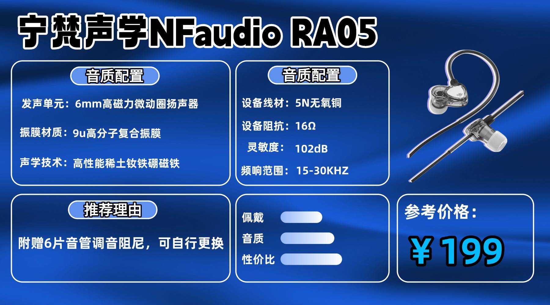 R A 05 的声音风格整体偏向理性自然。6mm 高磁力微动圈搭配 9μm 高分子复合振膜,音色呈现比较克制,器乐线条清晰但不过分强调情绪渲染,细节表达有序,不靠强烈刺激制造存在感。相比更高价位产品,高频的亮度与华丽感稍显保守,整体听感偏平稳。如果习惯重低频或强下潜风格,可能会觉得低频量感略少,需要通过 EQ 或低频取向耳套进行补偿。