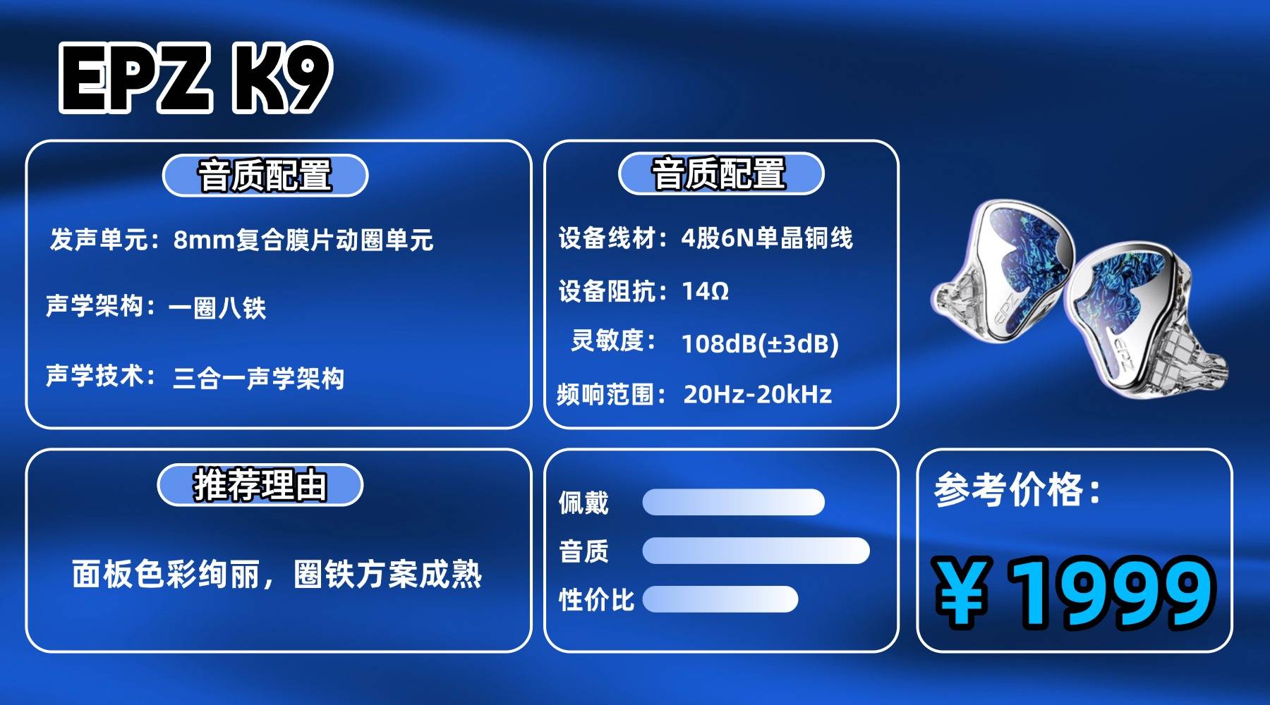 声音架构上,K9 采用一圈八铁的混合单元方案,8mm 的 PEK+PU 复合振膜动圈负责整体动态基础,信息量和规模感铺得比较完整。不过它的调音思路并不迎合“第一耳朵好听”,某些频段存在较强个性,初次上耳时容易产生风格判断分歧。声音表现对前端、耳套甚至线材的影响较为敏感,需要通过搭配来逐步找到适合自己的平衡点。标配 4 股 6N 单晶铜线mm 双针接口,后期换线与升级空间充足,整体规格符合两千元档的定位。综合来看,K9 更像是一副可调型耳机,不追求即刻讨好,而是留给用户足够的探索空间,适合已经有明确听音偏好、愿意花时间调整系统的玩家。