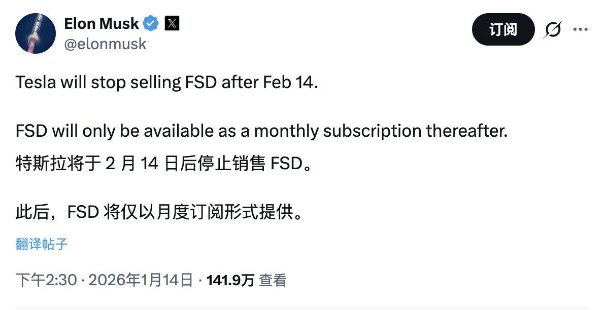 昨天,特斯拉 CEO 伊隆 · 马斯克发文宣布,特斯拉将于 2 月 14 日后停止销售 FSD 的买断版本。在此之后,FSD 将仅以月度订阅的形式向用户提供。