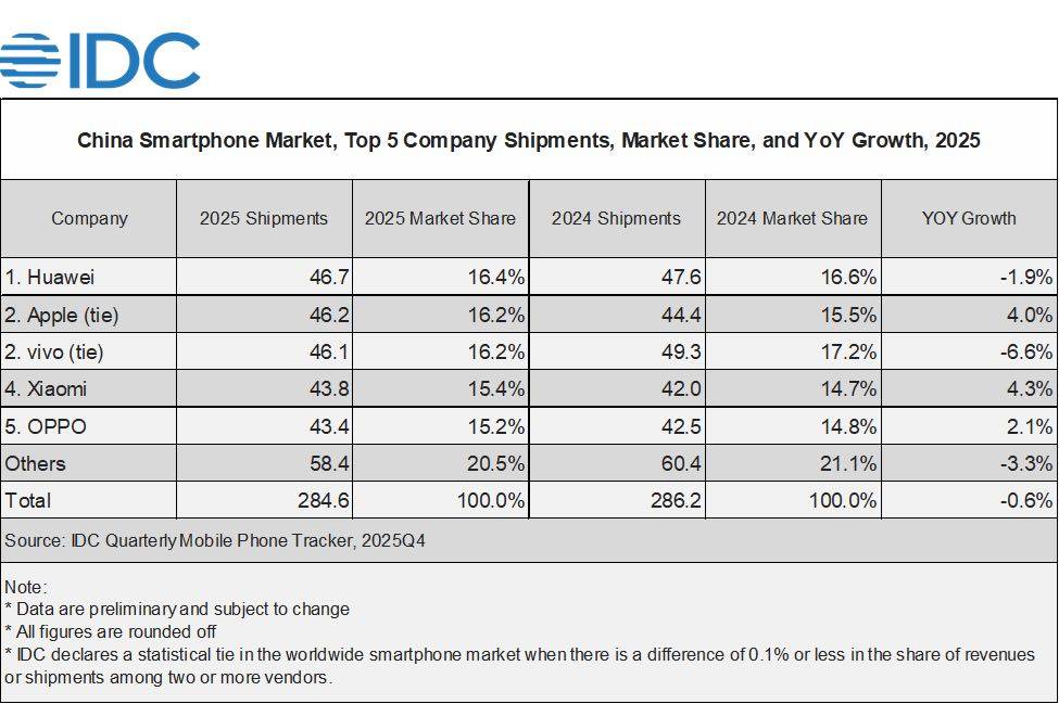 昨天,IDC 发布《全球季度踪报告》初步数据,显示去年第四季度全球与中国智能手机市场在高端化趋势与成本压力的双重作用下呈现出截然不同的走势,其中苹果在全球与中国市场均取得显著增长、华为重回中国市场出货量第一。
