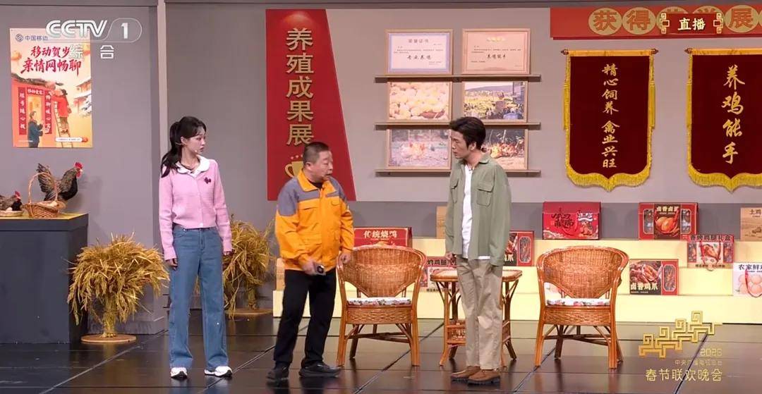而零点前的小品《又来了》场景切换到养鸡示范合作社。养鸡户王大哥在接待室里迎来送往一波波调查团,墙上同样有中国移动的海报默默陪伴。背景海报的巧妙出现,都让这份陪伴感在阖家围坐的场景中,显得格外自然。