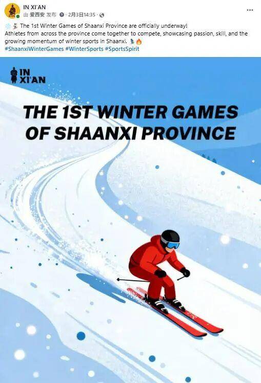 IN XI’AN在Facebook、Instagram和X平台分享陕西省第一届冬季运动会开幕相关内容。强调竞技精神与群众参与并行的体育氛围,体现陕西加快推动冬季运动普及与产业发展的成果。该帖文目前收获超25.2万浏览及6980+次互动。