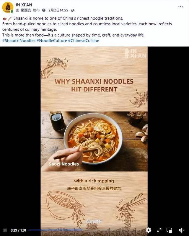 IN XI’AN在Facebook、X、Instagram、TikTok等平台分享AIGC面食视频,强调陕西面食承载的历史积淀与技艺传承,突出“时间、手艺与日常生活”共同塑造的饮食文化内涵。该帖文目前收获超31.8万浏览及1.7万+次互动。