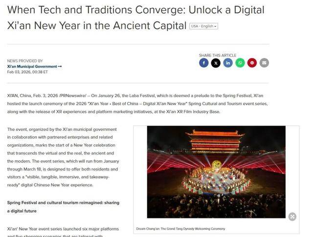 PR Newswire(美通社)发布报道《When Tech and Traditions Converge: Unlock a Digital Xian New Year in the Ancient Capital》(当科技遇见传统:在古都解锁数字化西安年)。报道称,西安市启动2026“西安年·最中国——数字西安年”春节文化和旅游系列活动,并在西安XR电影产业基地发布多项XR沉浸式体验与平台联动营销举措。报道指出,多平台协同整合文旅、消费、跨境支付和零售资源,优化入境游客体验,推出主题产品与促销活动。西安向全球游客发出邀请,欢迎在数字与现实交融的氛围中,感受传统中国年的文化底蕴与未来科技的创新活力。