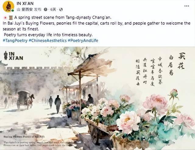 IN XI’AN在Facebook、Instagram和X平台分享唐代长安春日主题内容,以白居易诗歌《买花》为文化线索,再现牡丹盛放、车马往来、市井热闹的都城春景,凸显西安作为古都在文学与城市记忆中的文化象征意义。该帖文目前收获超39.8万浏览及7200+次互动。