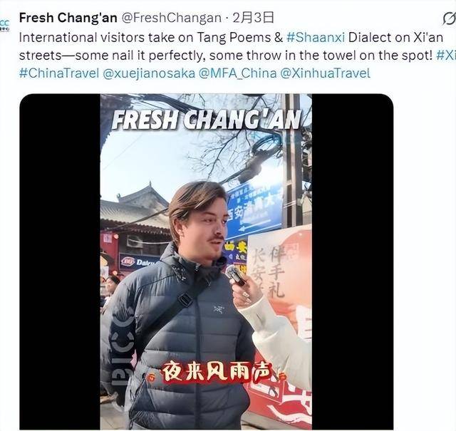 FreshChangan在多平台发布“外国人在西安街头学唐诗”“外国游客参观西安城墙灯会”短视频,展现西安唐诗文化及浓厚的新春氛围。