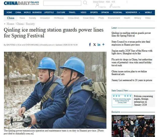 China Daily(中国日报网)发布报道《Qinling ice melting station guards power lines for Spring Festival》(秦岭融冰站护航春节电力安全)。报道指出,陕西秦岭的电力输电运维团队在春节期间坚守岗位,确保区域电力供应稳定。工作人员每天进行线路巡查、设备维护和应急监测,确保在冰雪天气下电力输送顺畅。融冰站不仅保障春节期间的安全用电,也承载着为陕西及周边地区经济社会发展提供稳定能源的重任。