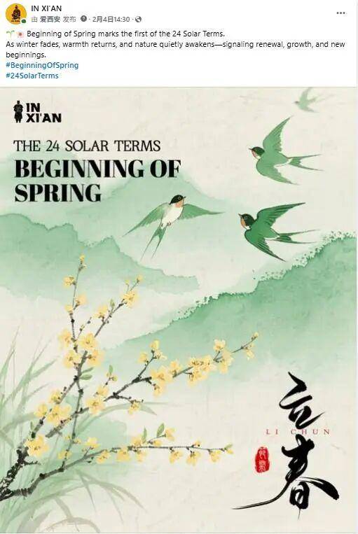 IN XI’AN在Facebook、Instagram和X平台分享立春节气主题海报,展现西安在传统节气表达中的东方美学气质与人文底蕴。该帖文目前收获超47.1万浏览及4300+次互动。
