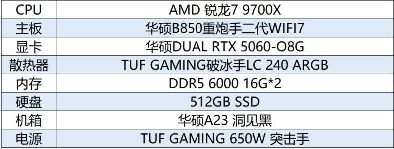 接下来给大家推荐一套冷酷军工风电竞小钢炮。以华硕B850重炮手二代WIFI7主板为核心,搭配AMD锐龙7 9700X处理器、华硕DUAL RTX 5060 O8G显卡等高性能硬件,高帧畅玩无压力!