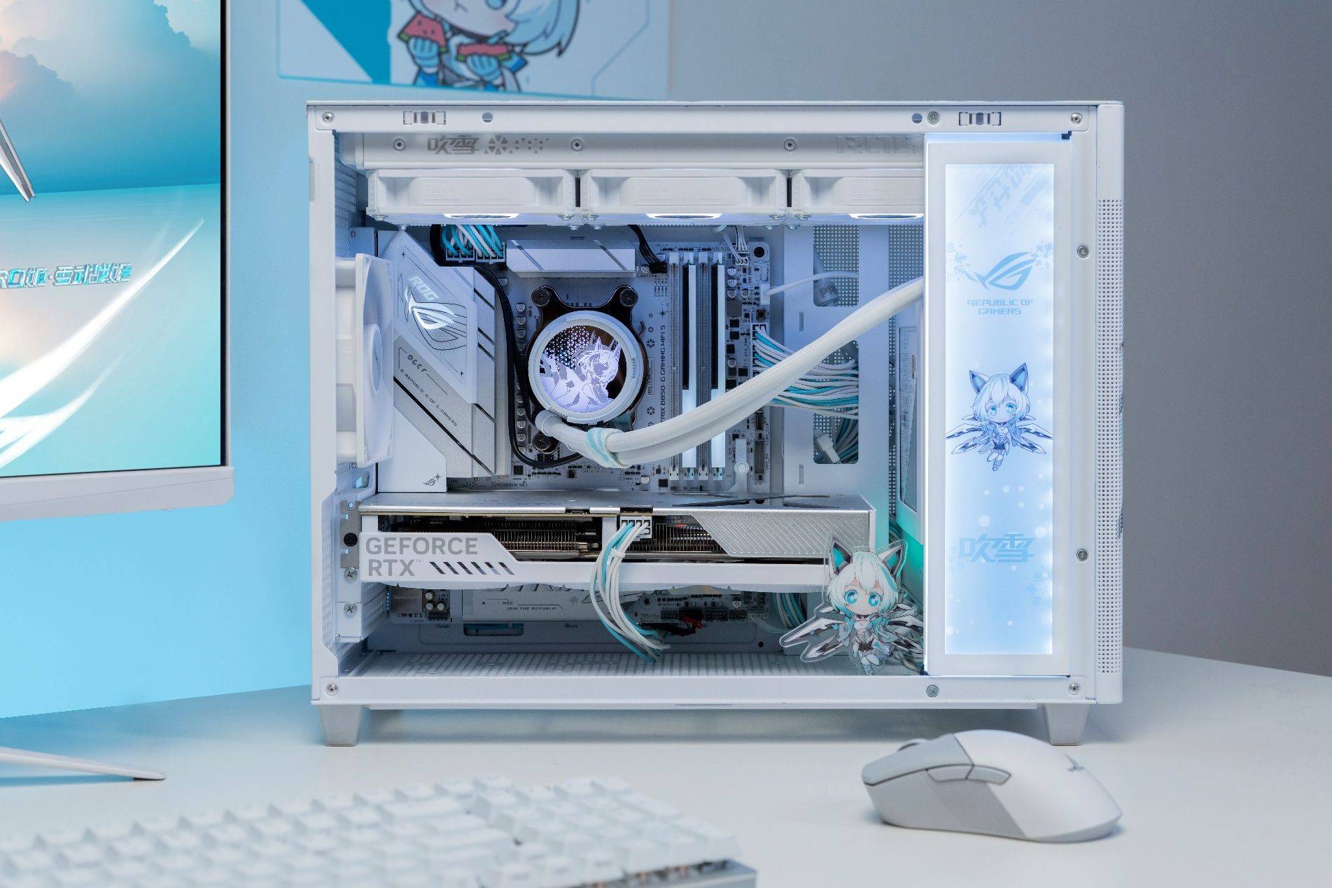 主板是整套主机的基石,十分重要。这里推荐的是吹雪家族新成员——华硕ROG B850小吹雪主板。其以突破性设计重塑电竞美学,加入雪武战姬主题元素,银白装甲搭配白色内存插槽和浅色PCB,白的彻底。再配合上支持神光同步的ROG LOGO,构建次元美学新标杆!该主板单品华硕商城到手价1599元,晒单返50元红包。