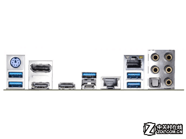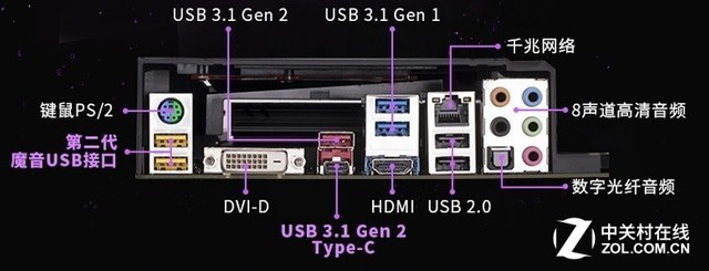 背部接口提供一个PS/2接口,四个USB3.0接口,一组USB3.1Type-A/C接口,一组DP/HDMI*2视频接口,一个万兆网口,一个Intel网卡接口,一组7.1声道板载音频接口。