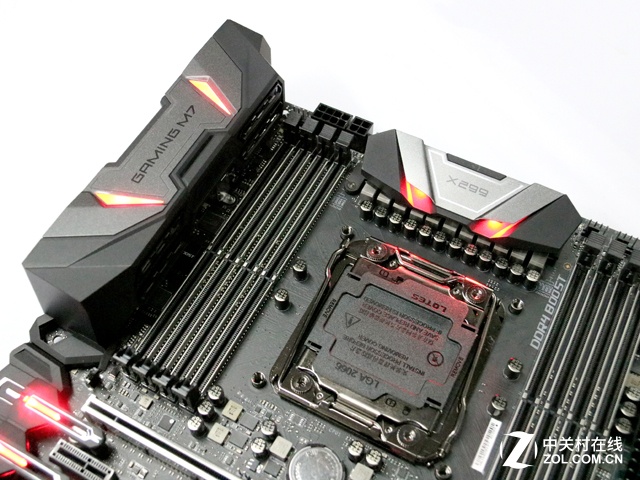 微星X299GAMINGM7ACK主板基于Intel全新的X299芯片组设计,搭载了新的LGA2066处理器接口,比上一代的X99平台针脚略少几十颗,看起来似乎并没有太大的外观差别。搭载11相CPU供电,8+4pin供电接口。同样是搭配了八条内存插槽,最大依然支持4通道内存。