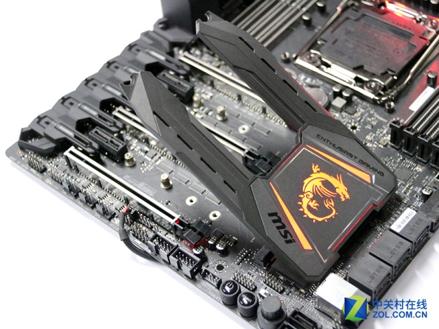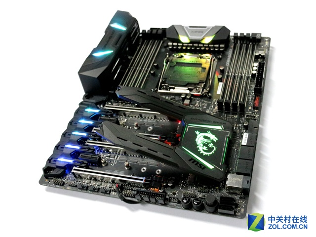 除此之外,微星的这款X299新品将南桥部分与M.2散热器整合到了一起,既解决了M.2设备的散热问题,又有效的避免了独立散热片不够美观、容易丢失的不足。并且,此次微星的X299主板将CPU散热、南桥和PCI-E插槽部分的LED灯光再次升级,便于用户搭配出更加酷炫的灯光效果。